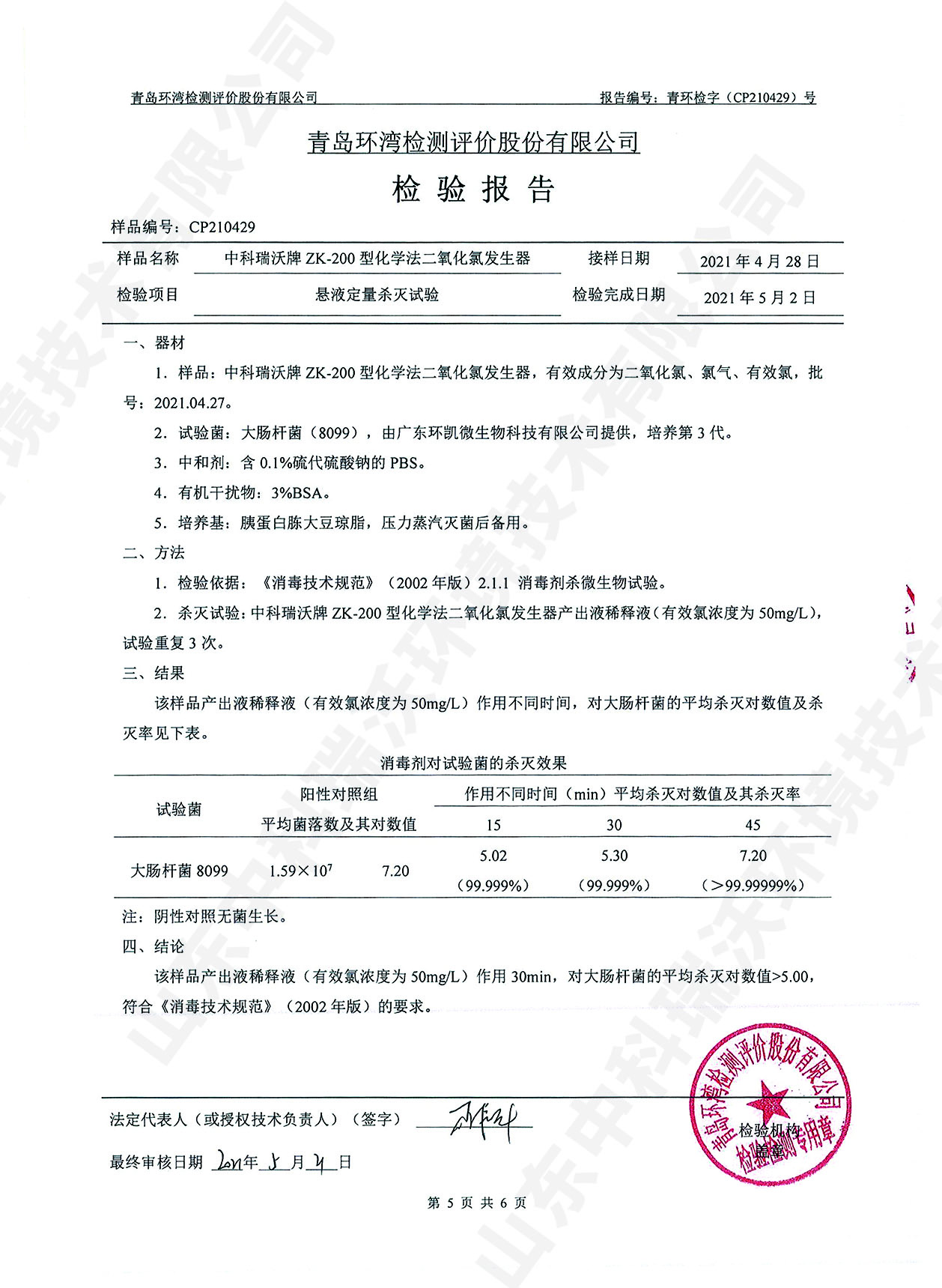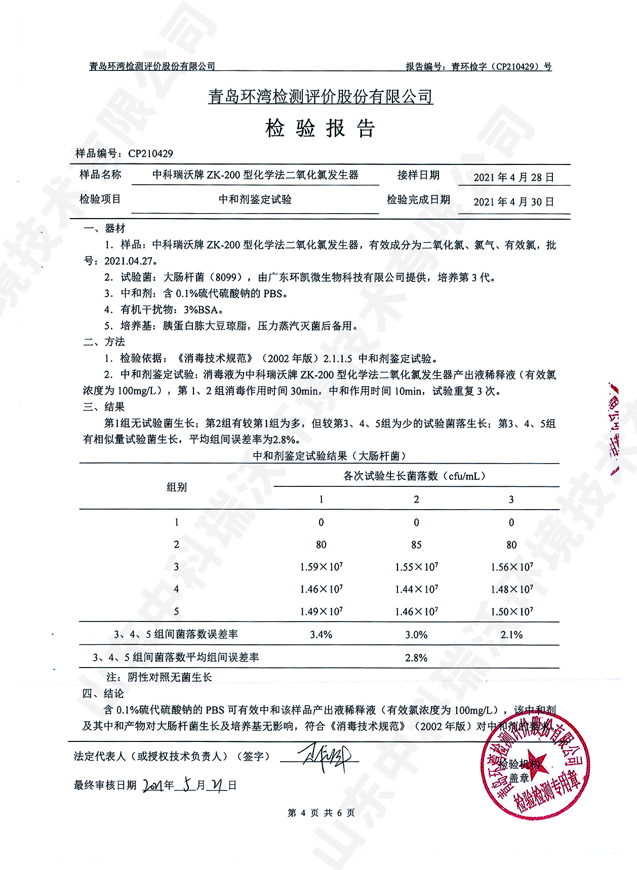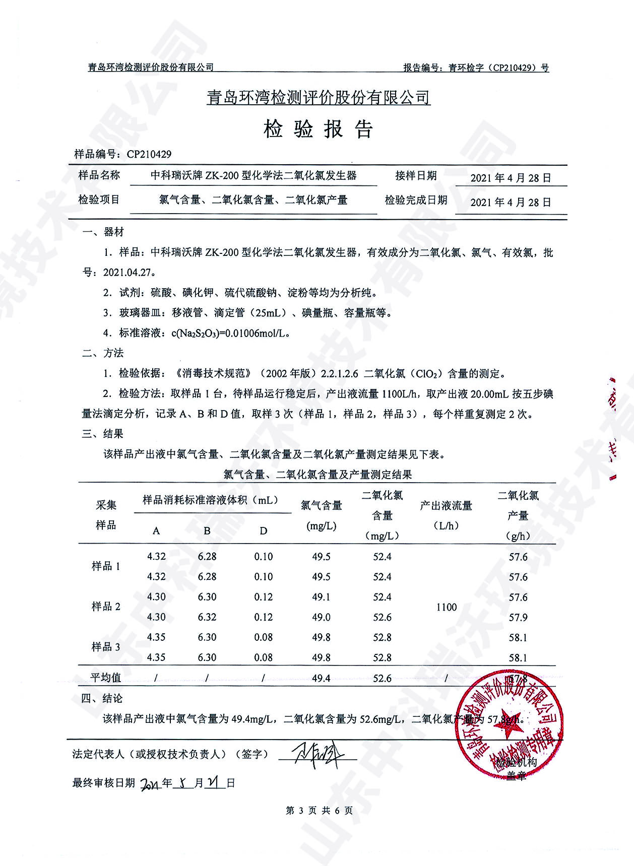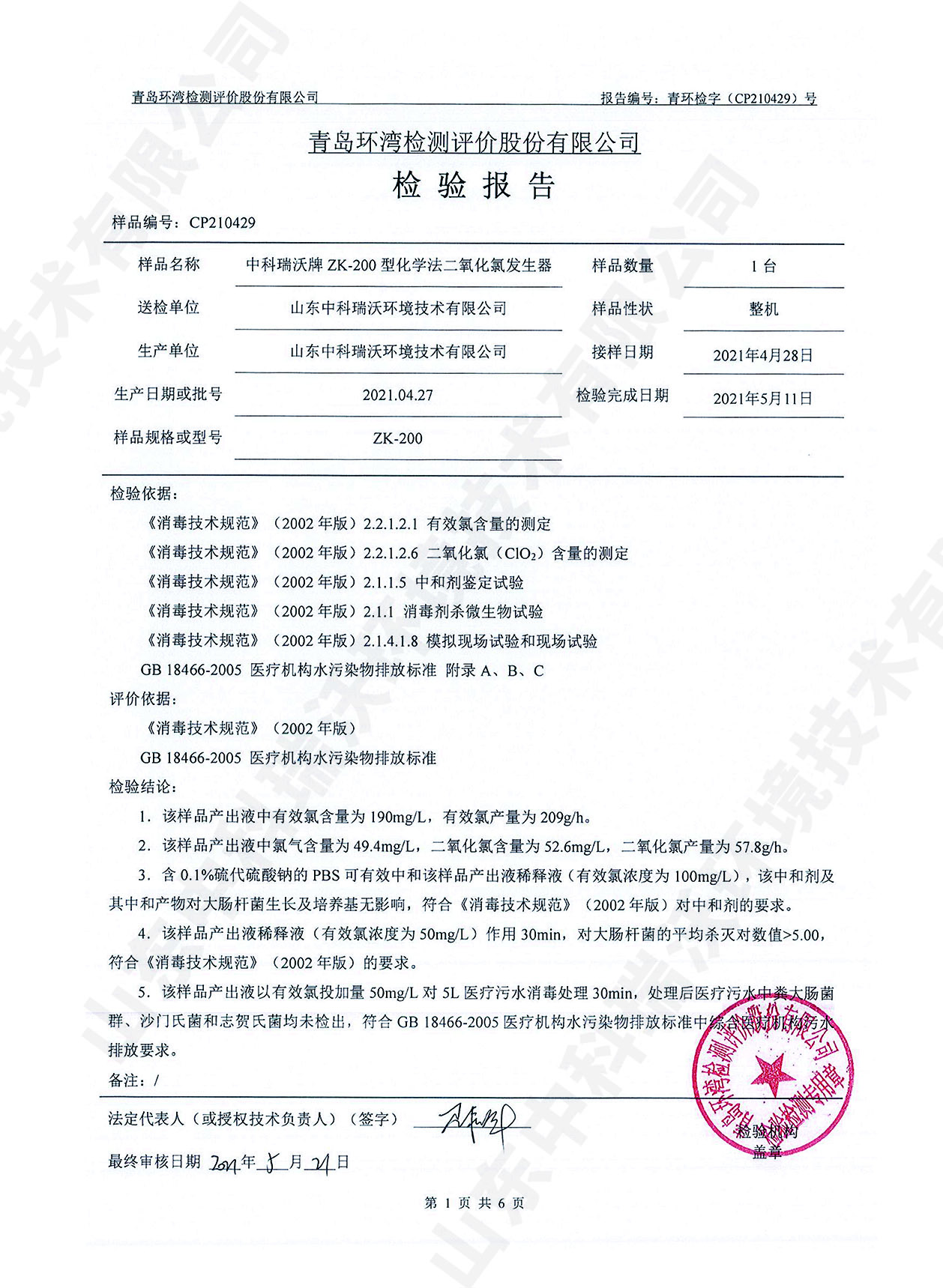 醫療污水處理設備檢測報告~二氧化氯消毒