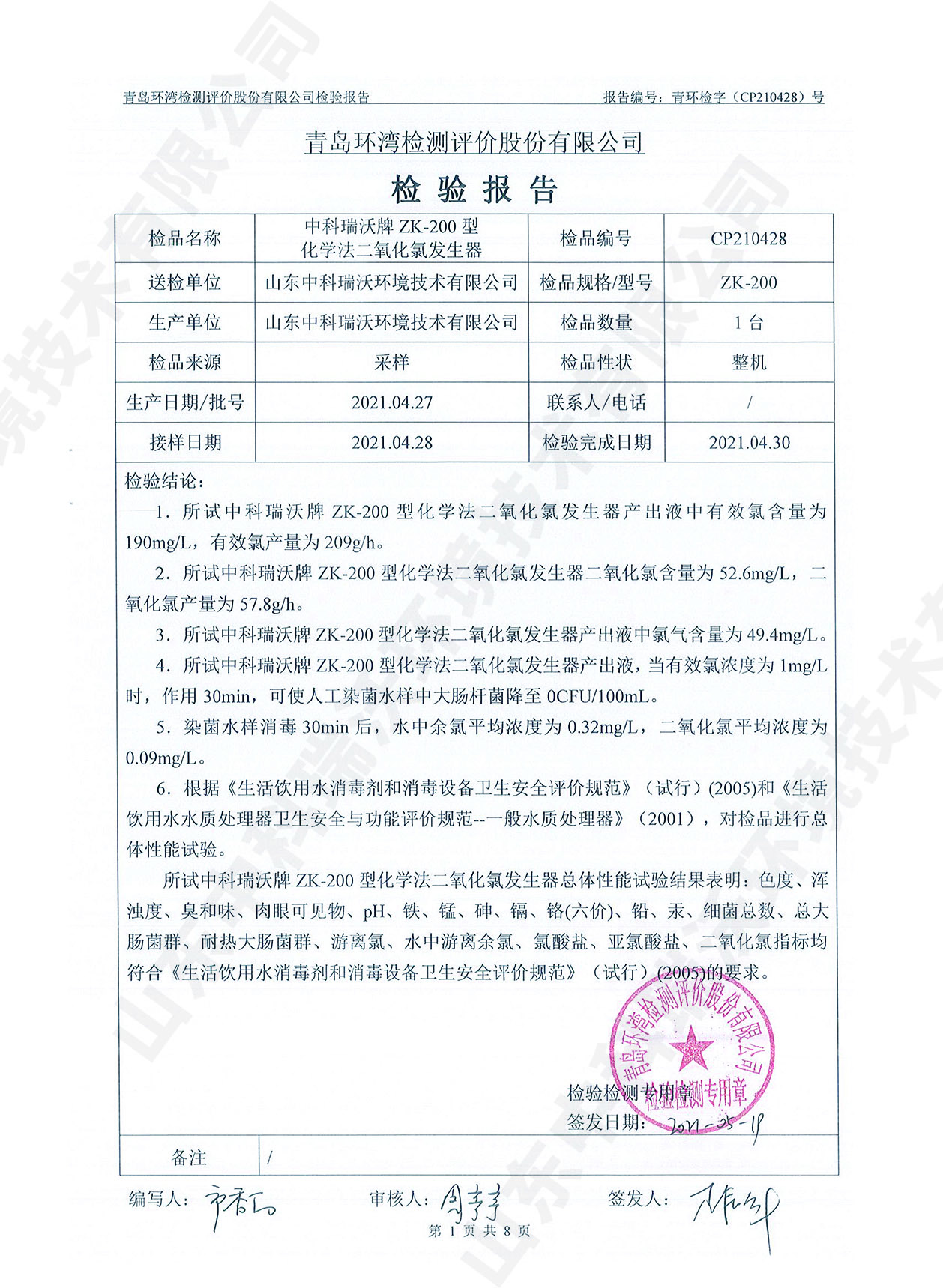 飲水消毒設備檢測報告~二氧化氯消毒