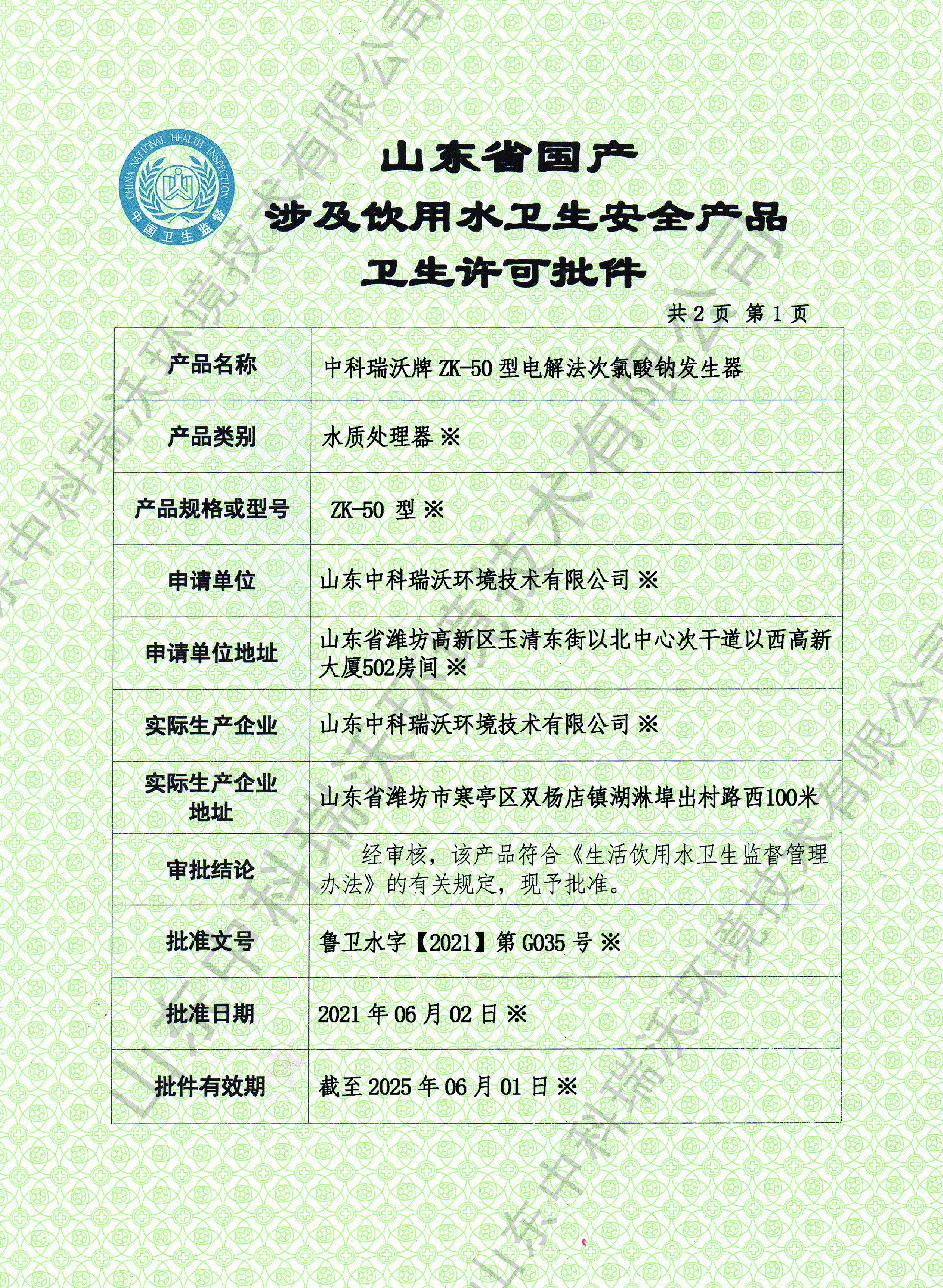 電解次氯酸鈉衛生許可批件